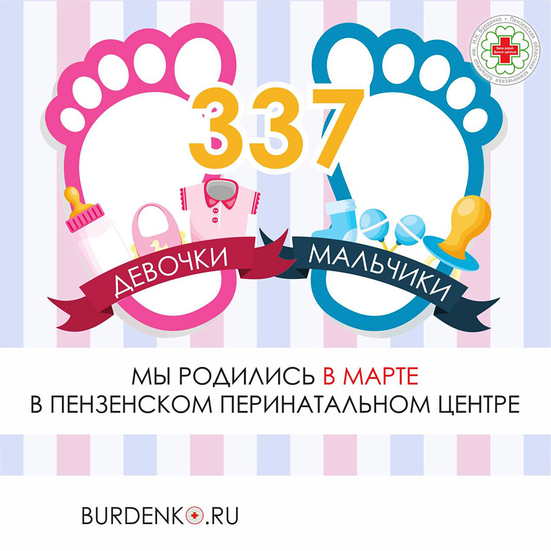 В марте 2022 года в Пензенском перинатальном центре ГБУЗ ПОКБ им. Н.Н. Бурденко родились 337новых жителей Пензенской области, среди них 174 мальчиков и 163 девочек. Среди рождённых было 5 двоен, из которых 2 двойни родились при помощи ЭКО.